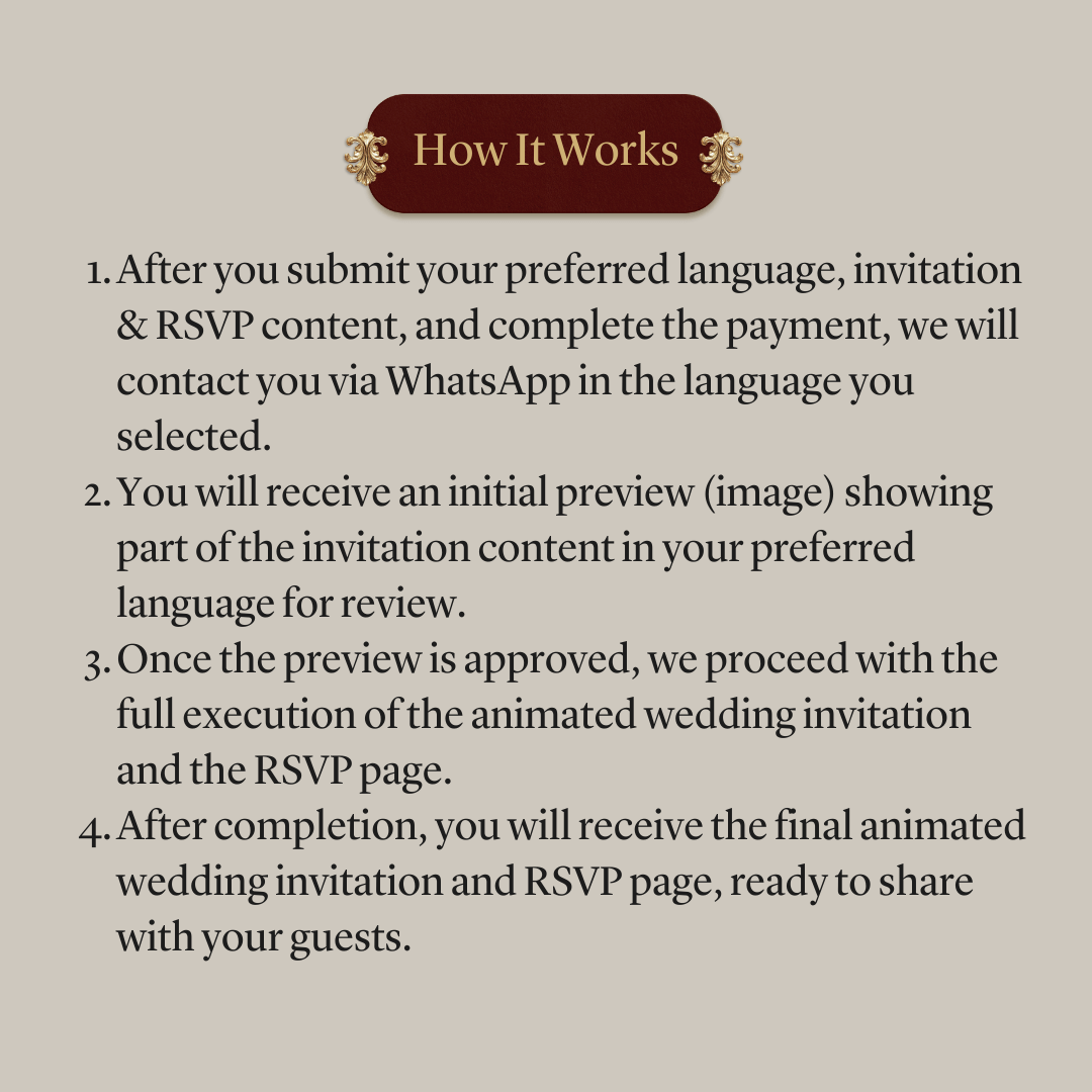 After you submit your preferred language, invitation & RSVP content, and complete the payment, we will contact you via WhatsApp in the language you selected.