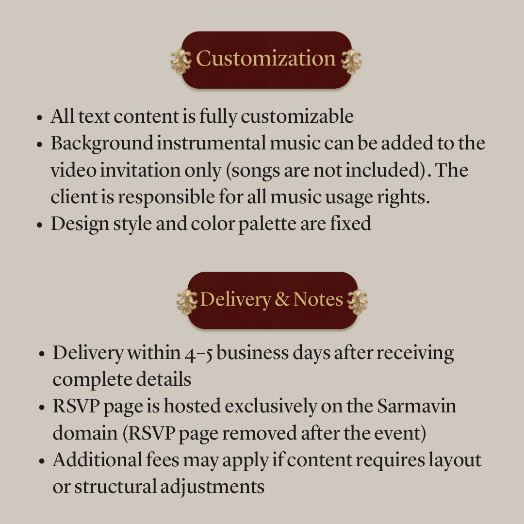 Background instrumental music can be added to the video invitation only (songs are not included). The client is responsible for all music usage rights